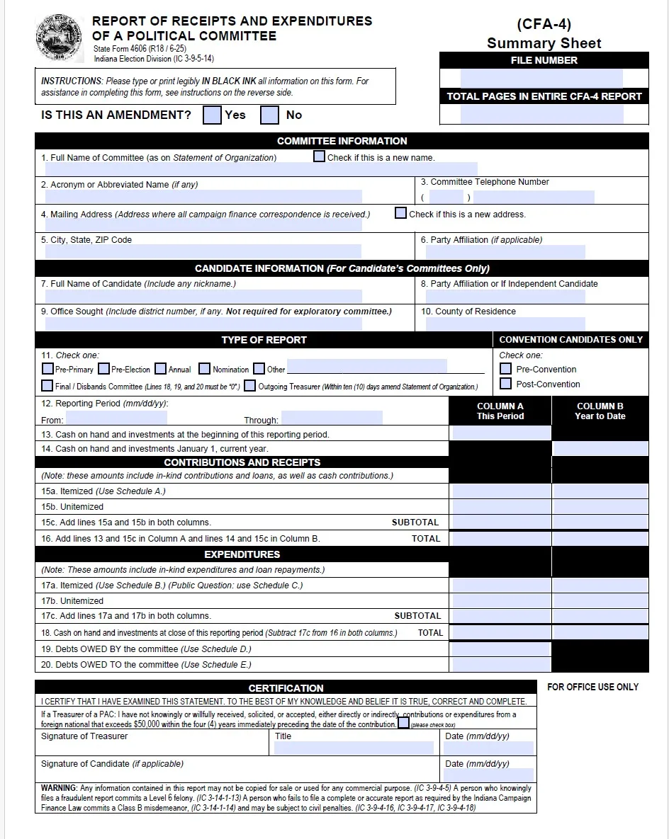 Indiana’s CFA-4 Report of Receipts and Expenditures (State Form 4606) is required for candidates and political committees across the state.